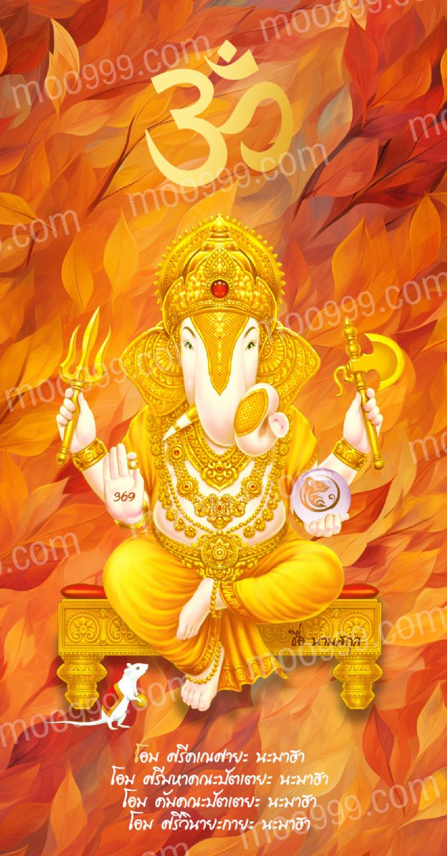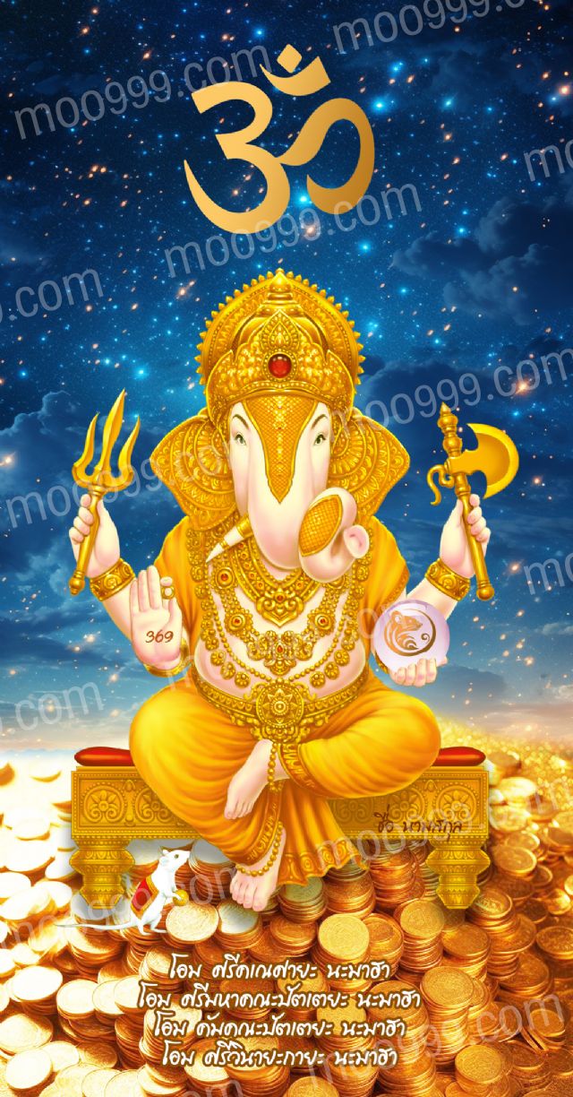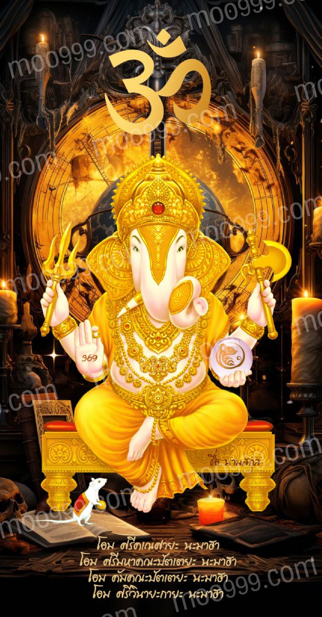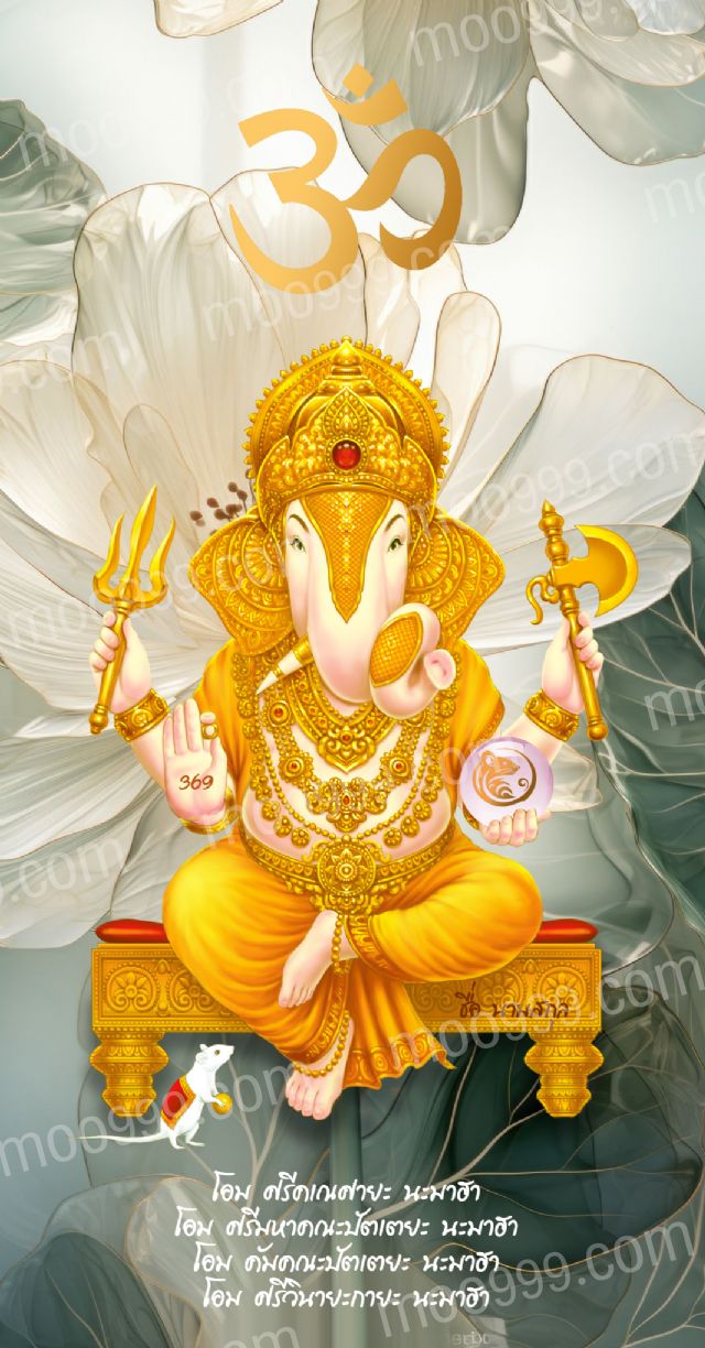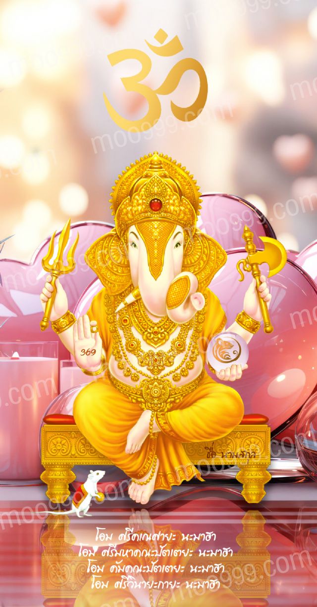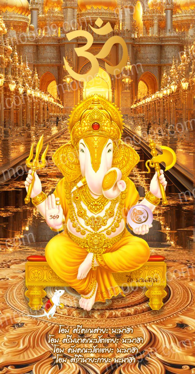 องค์พระพิฆเนศแห่งเมืองปูเน่อินเดีย (Dagduseth Hawai) ปางประทานพร ทรงเครื่องประดับทองคำแท้และเพชรพลอยหลากสี งวงม้วนเป็นเกลียวเพื่อดึงดูดสิ่งดีๆและโชคลาภ มือซ้ายถือตรีศูลแห่งพระศิวะอำนวยชัยให้มีอำนาจบารมี มือขวาถือขวานช่วยทำลายอุปสรรคขวางหนามและดวงแก้วสารพัดนึกที่บันดาลให้สมปรารถนาในสิ่งที่หวัง